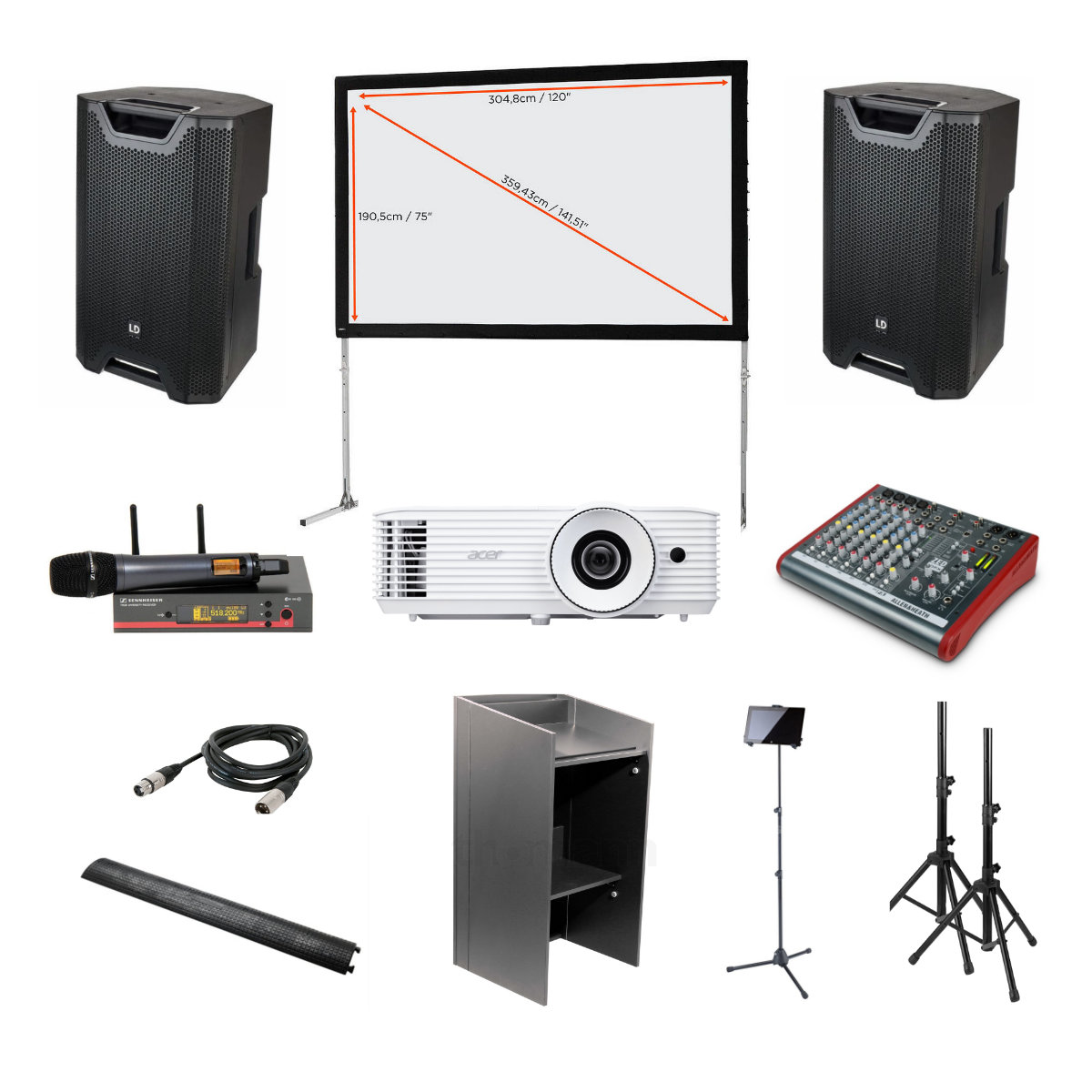 Pakete und Überblick für Konferenztechnik, Beamer mit Leinwand oder Musikanlagen bieten wir ebenfalls im günstigen Bundle an.